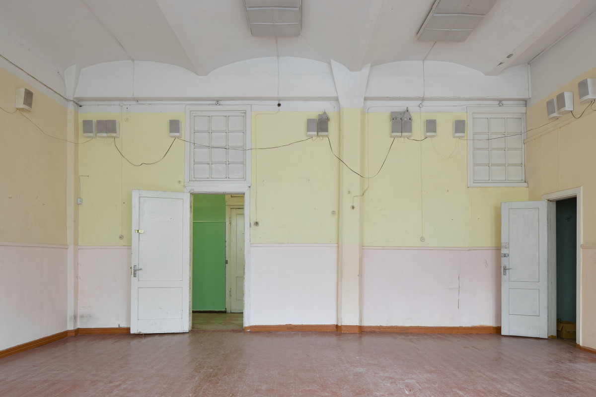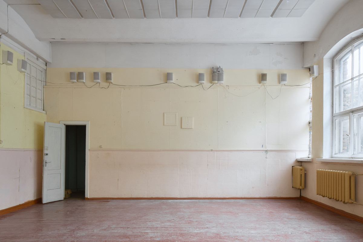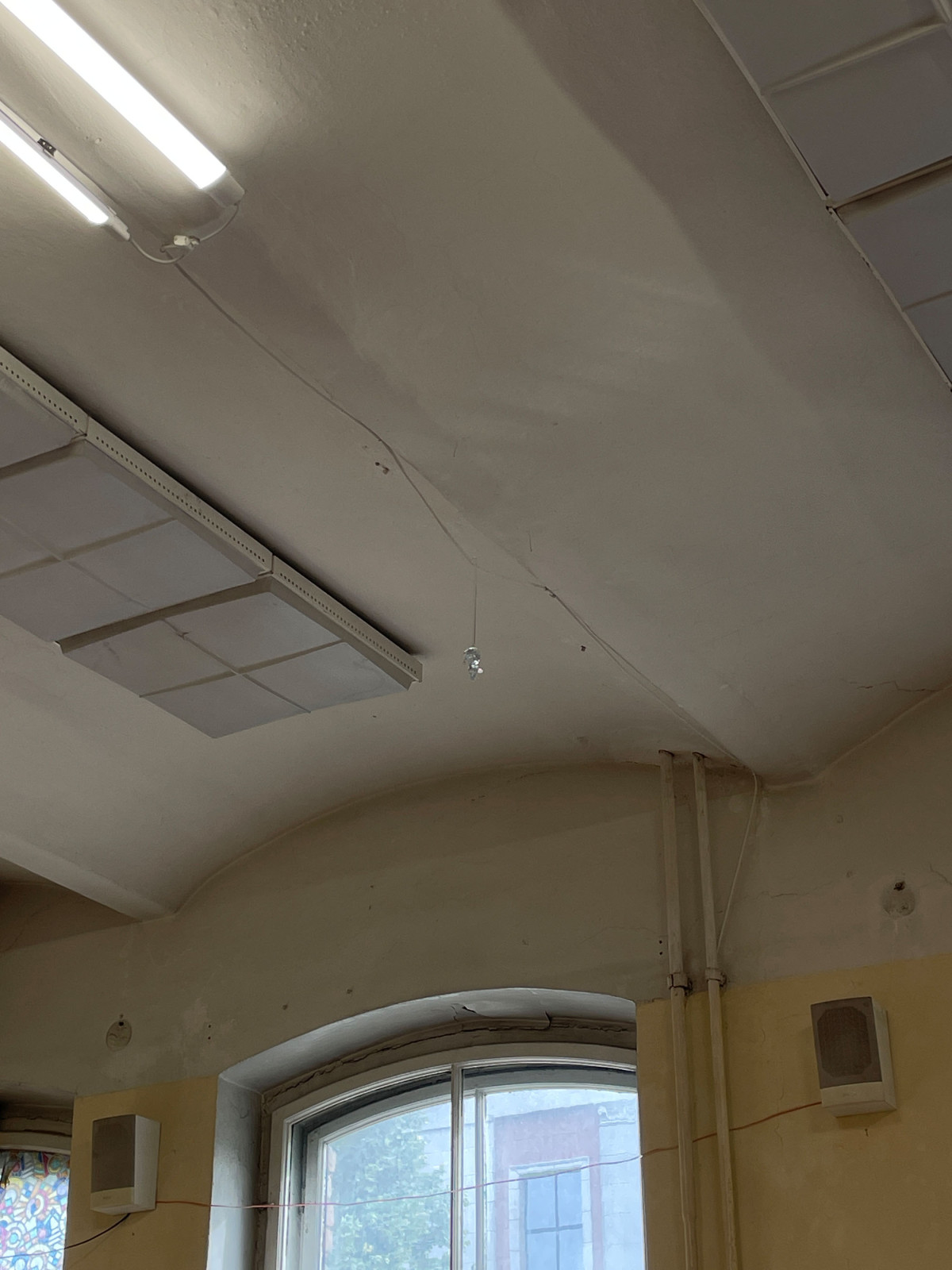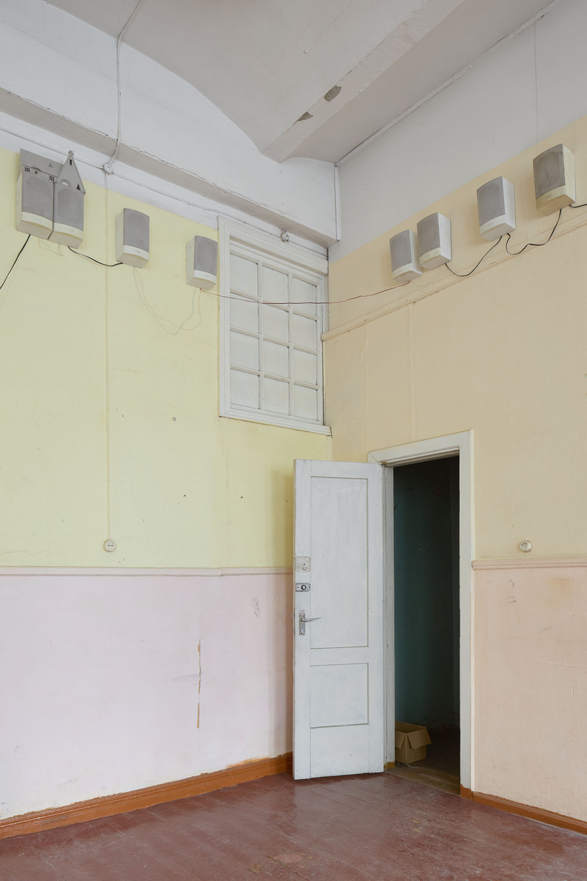 fig.1 Daisy Chain, 2025 33 speakers; various wiring; loopedaudio file (5:42); fragmented architectural models (Brīvības iela37, Brīvības iela 47, Ģertrūdes iela23, Krišjāņa Valdemāra iela 67); rented amplifier; beeswax candles infused with propolis; granyōnki sourced from Latgale flea market; homemade lightly salted cucumbers; borrowed glassware; borrowed media player; bundles of twigs collected at Hanzas iela 22; LED twig bundle from the artist's apartment; packaging; cardboard box containing oak leaves and found keys. room-sized