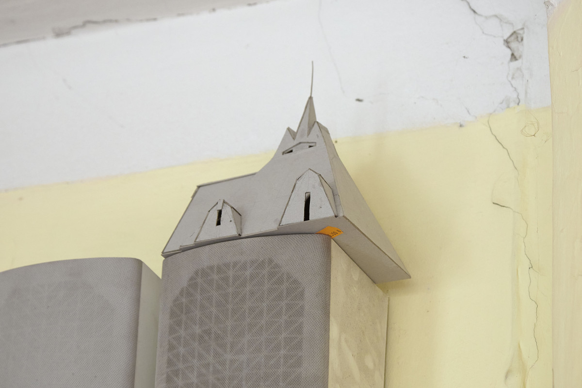 fig.9 Daisy Chain (Detail), 2025 33 speakers; various wiring; loopedaudio file (5:42); fragmented architectural models (Brīvības iela37, Brīvības iela 47, Ģertrūdes iela23, Krišjāņa Valdemāra iela 67); rented amplifier; beeswax candles infused with propolis; granyōnki sourced from Latgale flea market; homemade lightly salted cucumbers; borrowed glassware; borrowed media player; bundles of twigs collected at Hanzas iela 22; LED twig bundle from the artist's apartment; packaging; cardboard box containing oak leaves and found keys. room-sized