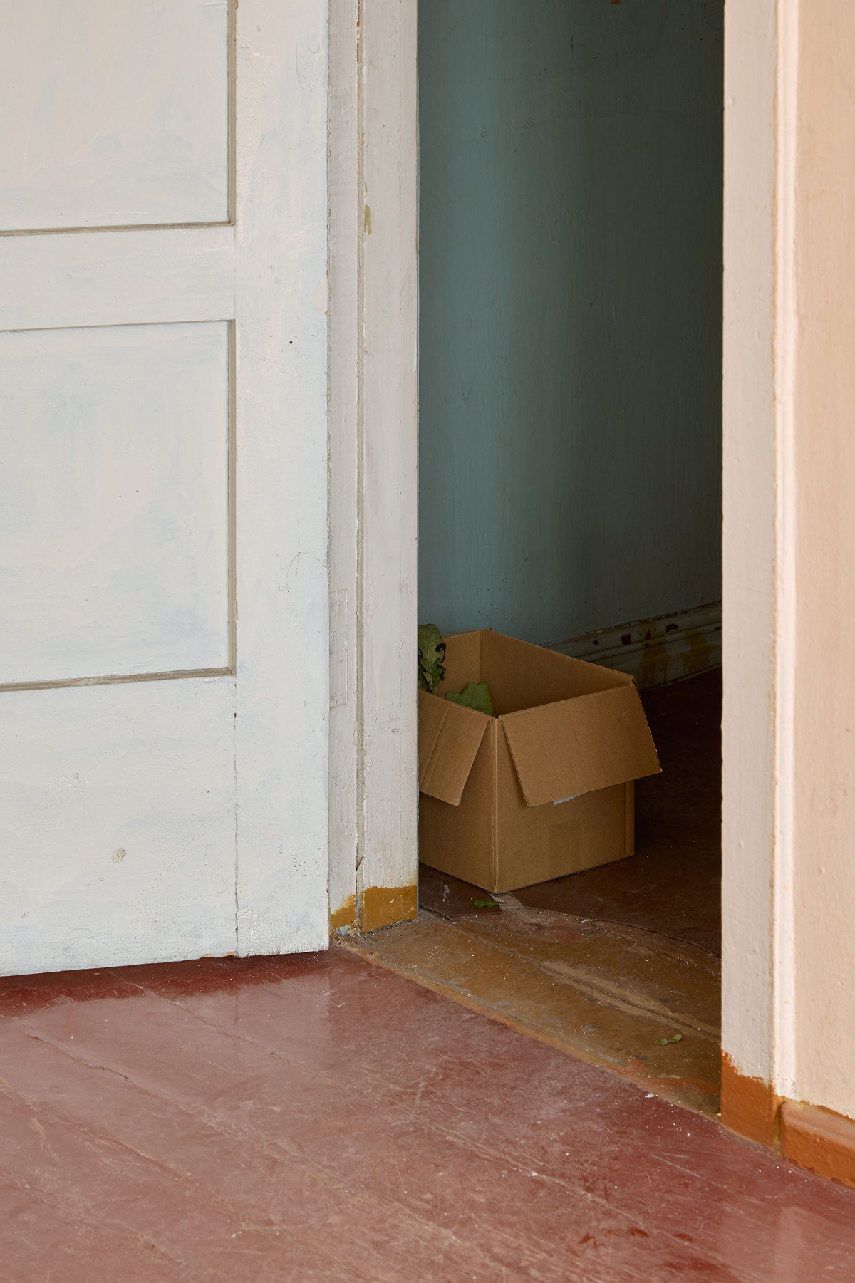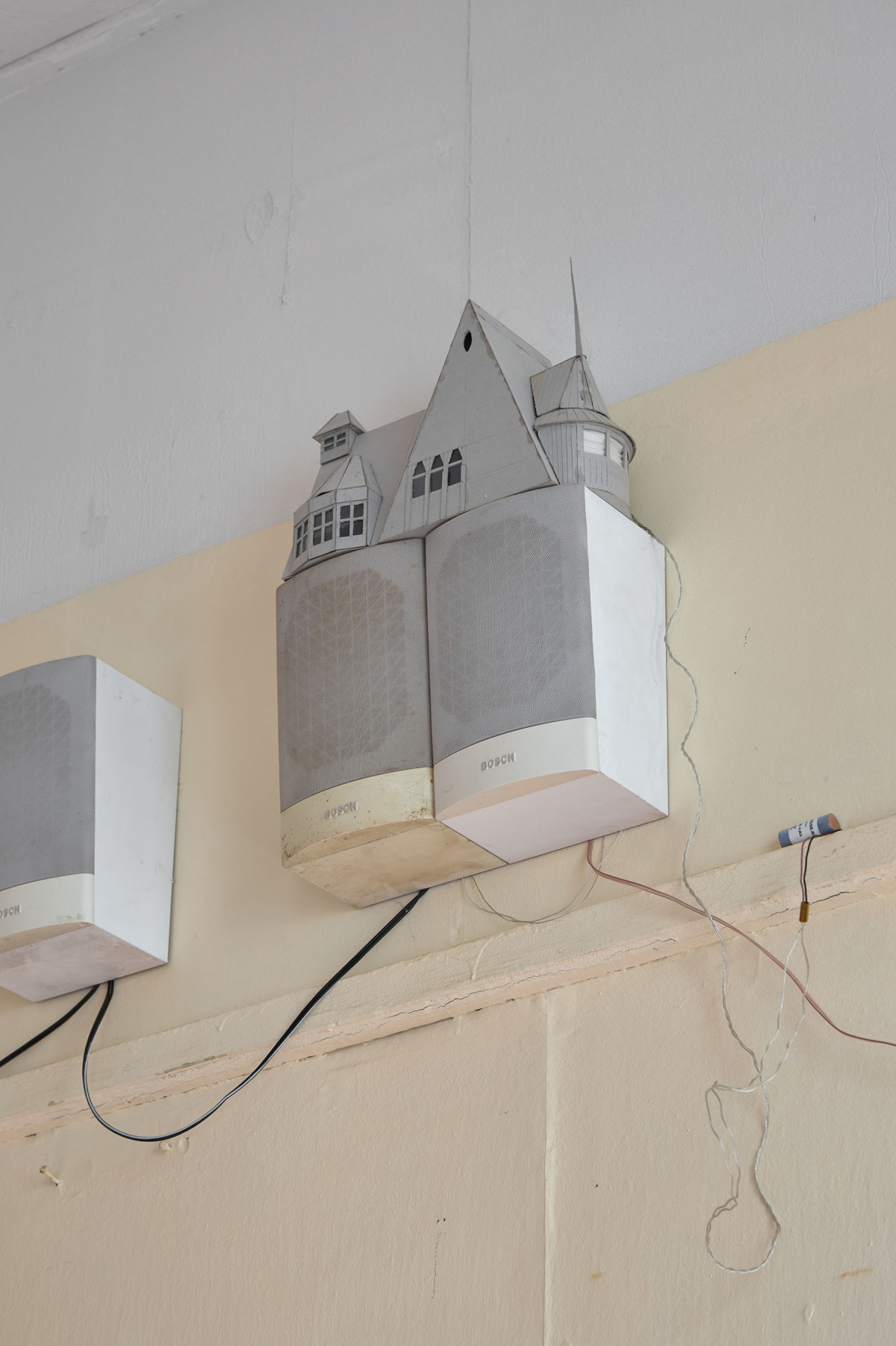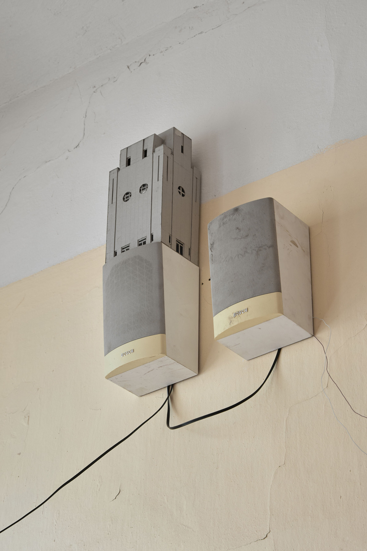 fig.20 Daisy Chain (Detail), 2025 33 speakers; various wiring; loopedaudio file (5:42); fragmented architectural models (Brīvības iela37, Brīvības iela 47, Ģertrūdes iela23, Krišjāņa Valdemāra iela 67); rented amplifier; beeswax candles infused with propolis; granyōnki sourced from Latgale flea market; homemade lightly salted cucumbers; borrowed glassware; borrowed media player; bundles of twigs collected at Hanzas iela 22; LED twig bundle from the artist's apartment; packaging; cardboard box containing oak leaves and found keys. room-sized