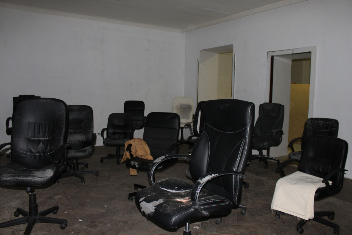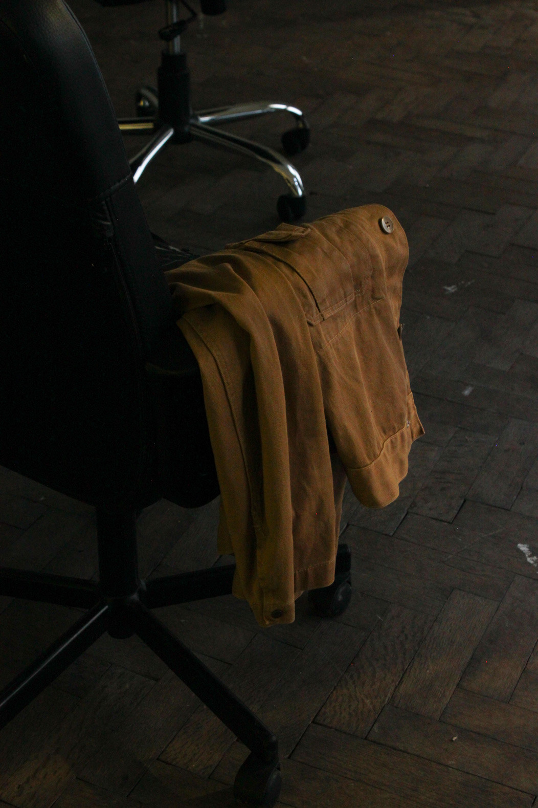 fig.25 The Power of Denial (Room 3) (Detail), 2020 19 used office-chairs, a jacket, a hook, a bag, a bluetooth speaker, a doorstop, a piece of cloth, objekt a various dimensions