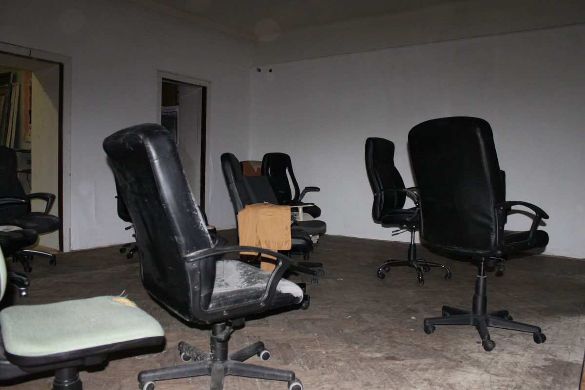 fig.8 New In Town (Room 1), 2020 19 used office-chairs, a jacket, a hook, a bag, a bluetooth speaker, a doorstop, a piece of cloth, objekt a various dimensions