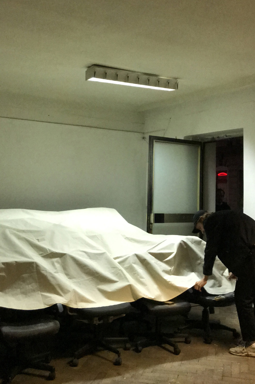fig.3 New In Town (Room 1), 2020 19 used office-chairs, a jacket, a hook, a bag, a bluetooth speaker, a doorstop, a piece of cloth, objekt a various dimensions