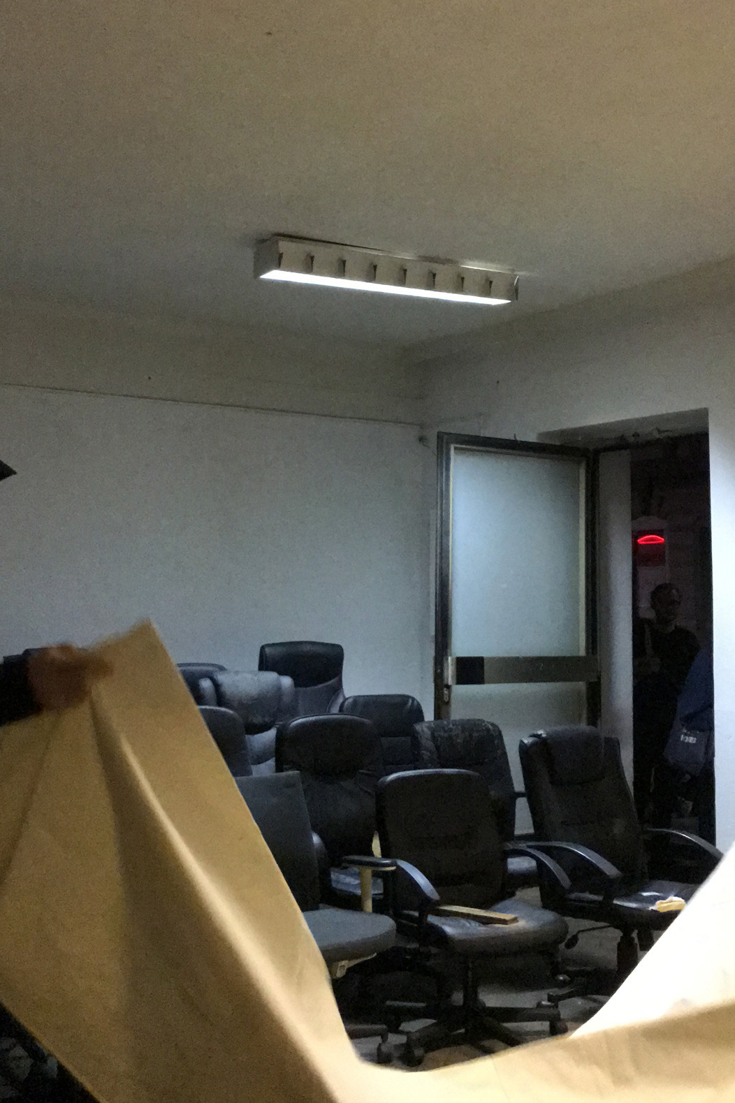 fig.23 The Power of Denial (Room 3) (Detail), 2020 19 used office-chairs, a jacket, a hook, a bag, a bluetooth speaker, a doorstop, a piece of cloth, objekt a various dimensions